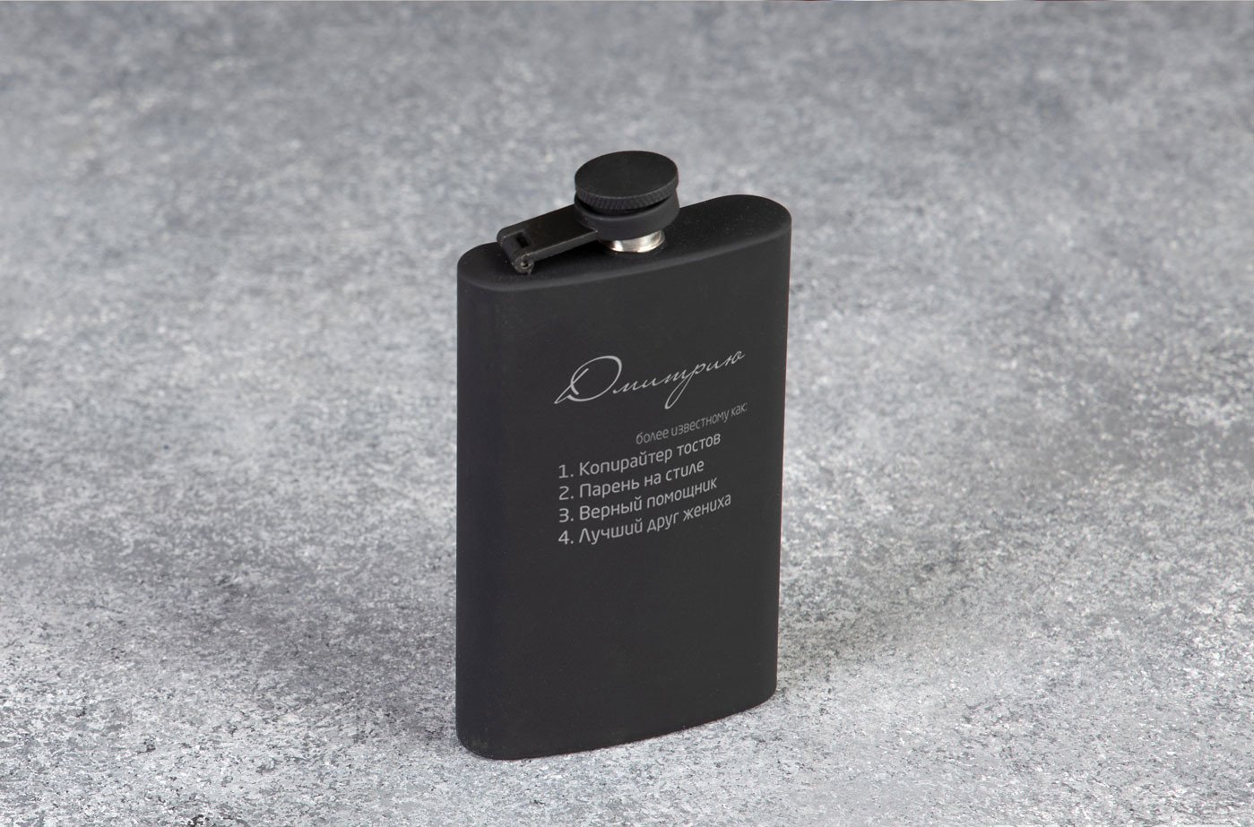 Ця фляга з персональним гравіюванням відмінно підійде як подарунок на день народження любителям завжди носити найцінніше з собою! Фляга виконана у стриманому чорному кольорі. Персональне гравіювання робить цю флягу не тільки корисним, але й унікальним подарунком. Обдарований завжди буде згадувати про Вас, носячи свій улюблений напій із собою